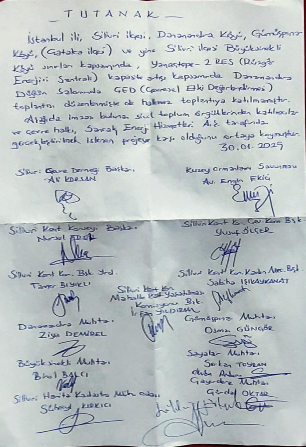 Tutanakta: “Aşağıda imzası bulunan sivil toplum örgütlerinden katılanlar ve çevre halkı; Sancak Enerji Hizmetleri A.Ş tarafından gerçekleştirilmek istenen projeye karşı olduklarını ortaya koydular” satırları yer aldı.