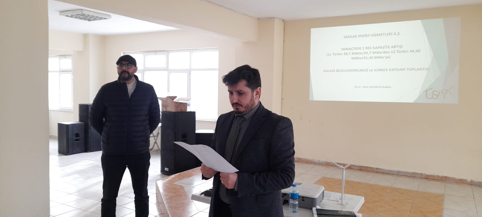 Yukarıdaki salonda ise prosederü yerine getirmeye çalışılıyordu. Muhtar Ziya Demirel, salona gelerek halkın kapasite artışına kesin karşı olduğunu ve bilgilenmek istemediğini söyledi. Bunun üzerine İstanbul Çevre ve İklim Değişikliği İl Müdürlüğü ÇED Şube Müdürü Sevdinç Terzi; boş kalan salona karşı; Sancak Enerji tarafından yapılacak EK1 kapasite artışı Halkın Katılımı Toplantısı gerçekleştireceğiz. Şuan halk bilgilendirme almak istemediği için toplantıyı sonlandırıyoruz” dedi. Resmi heyet daha sonra tutanağı imzalayarak salondan ayrıldı.