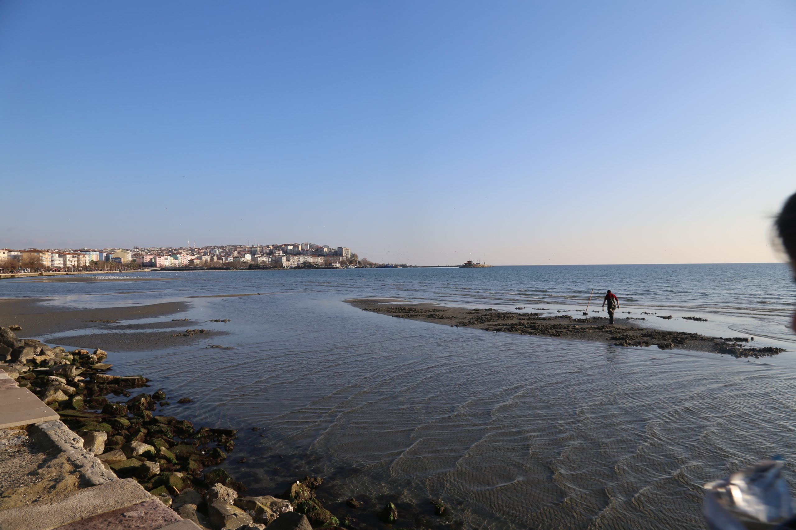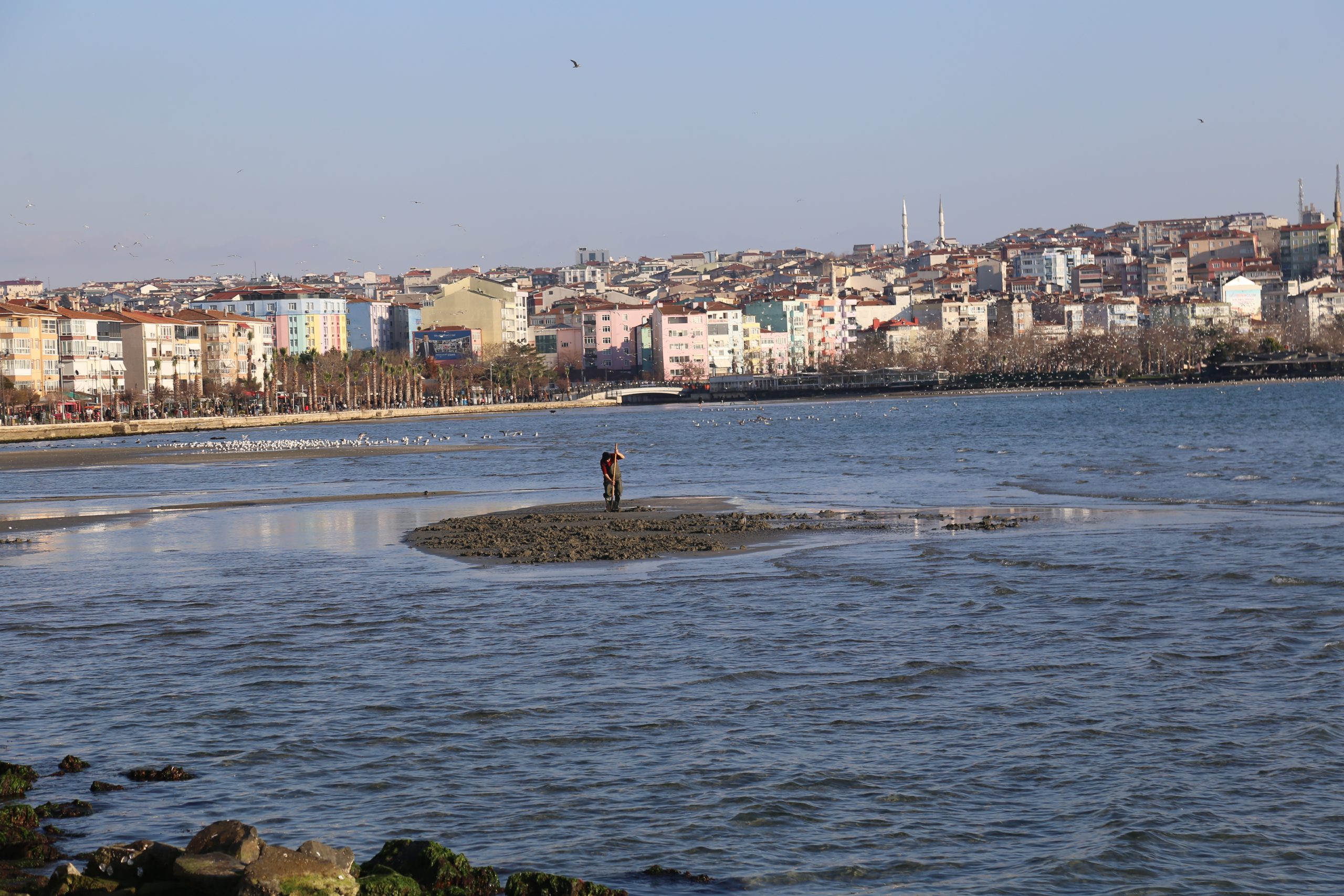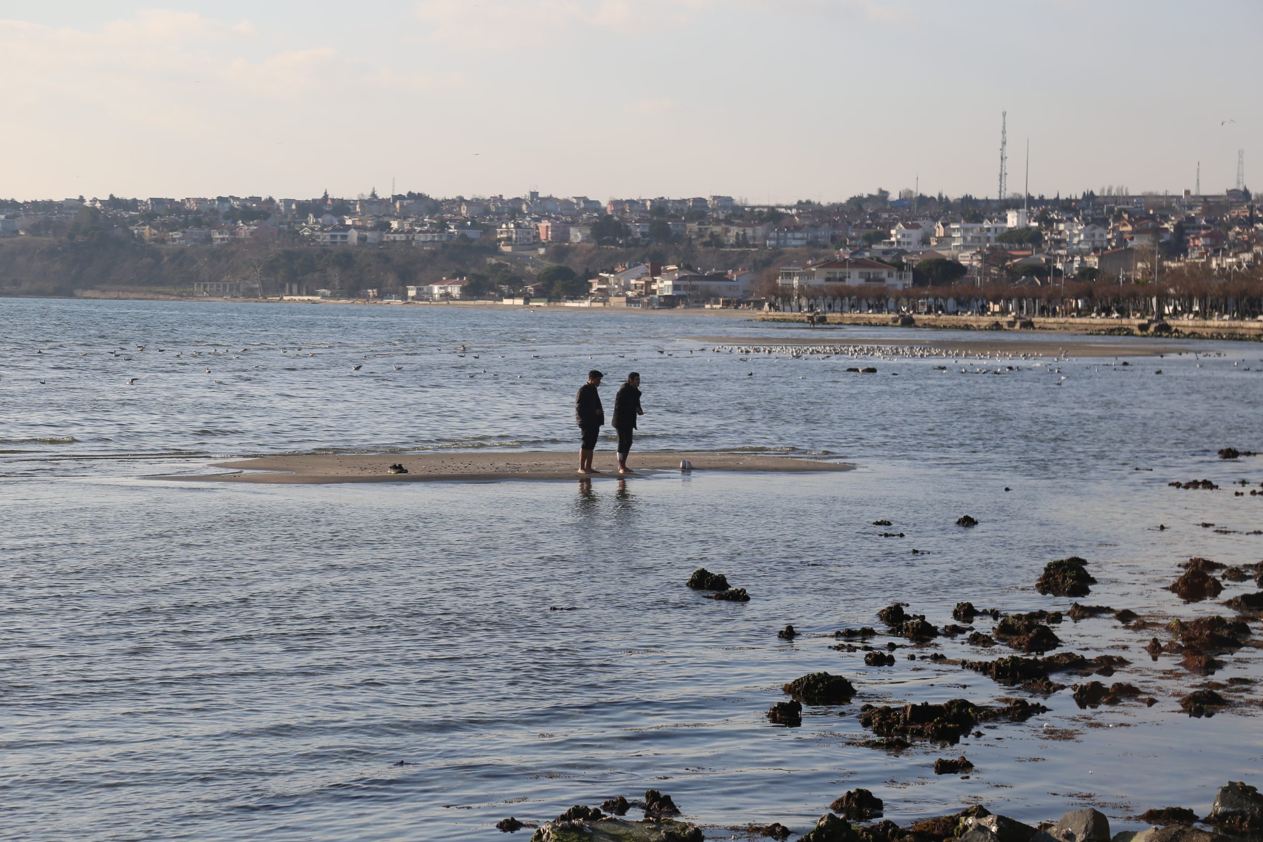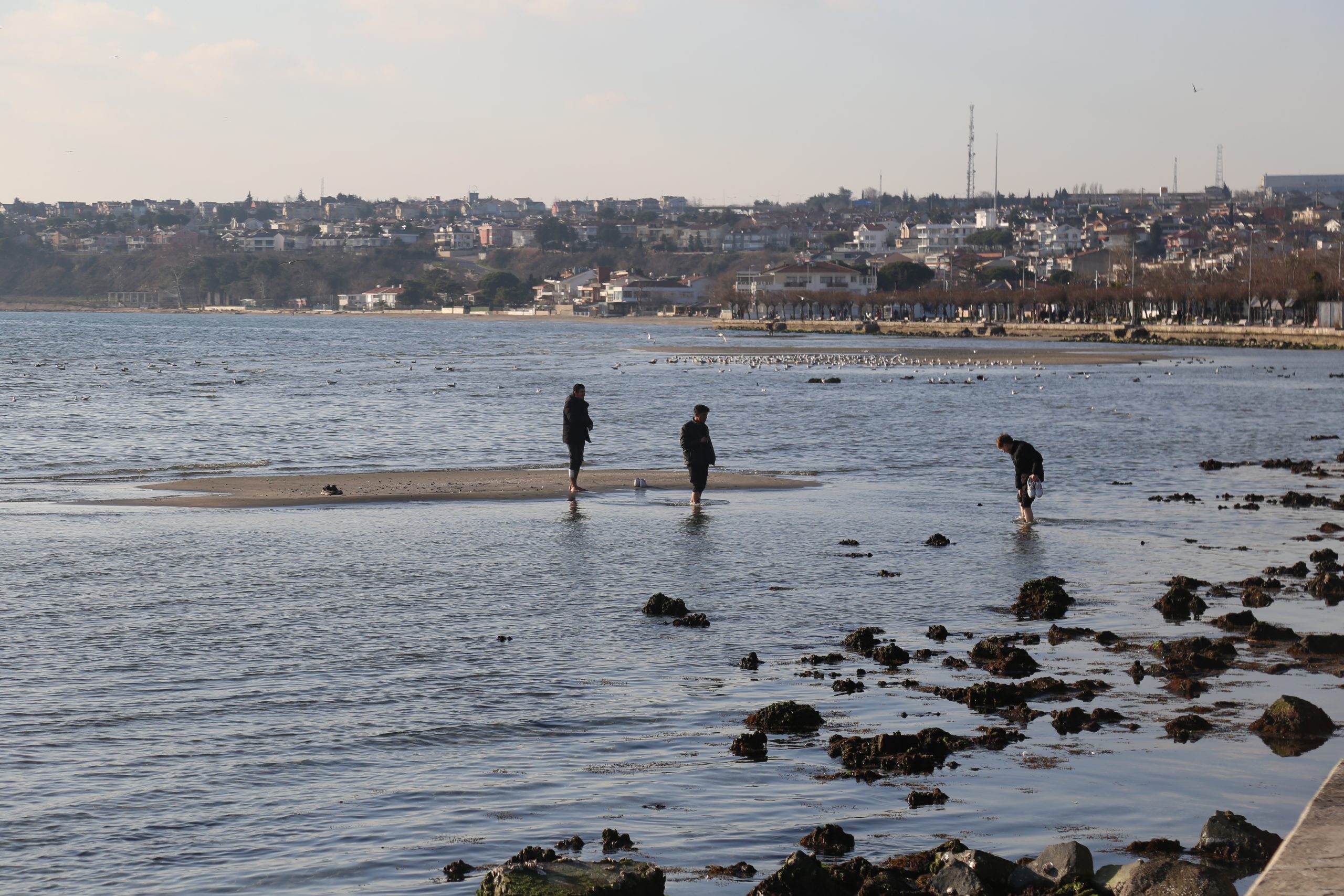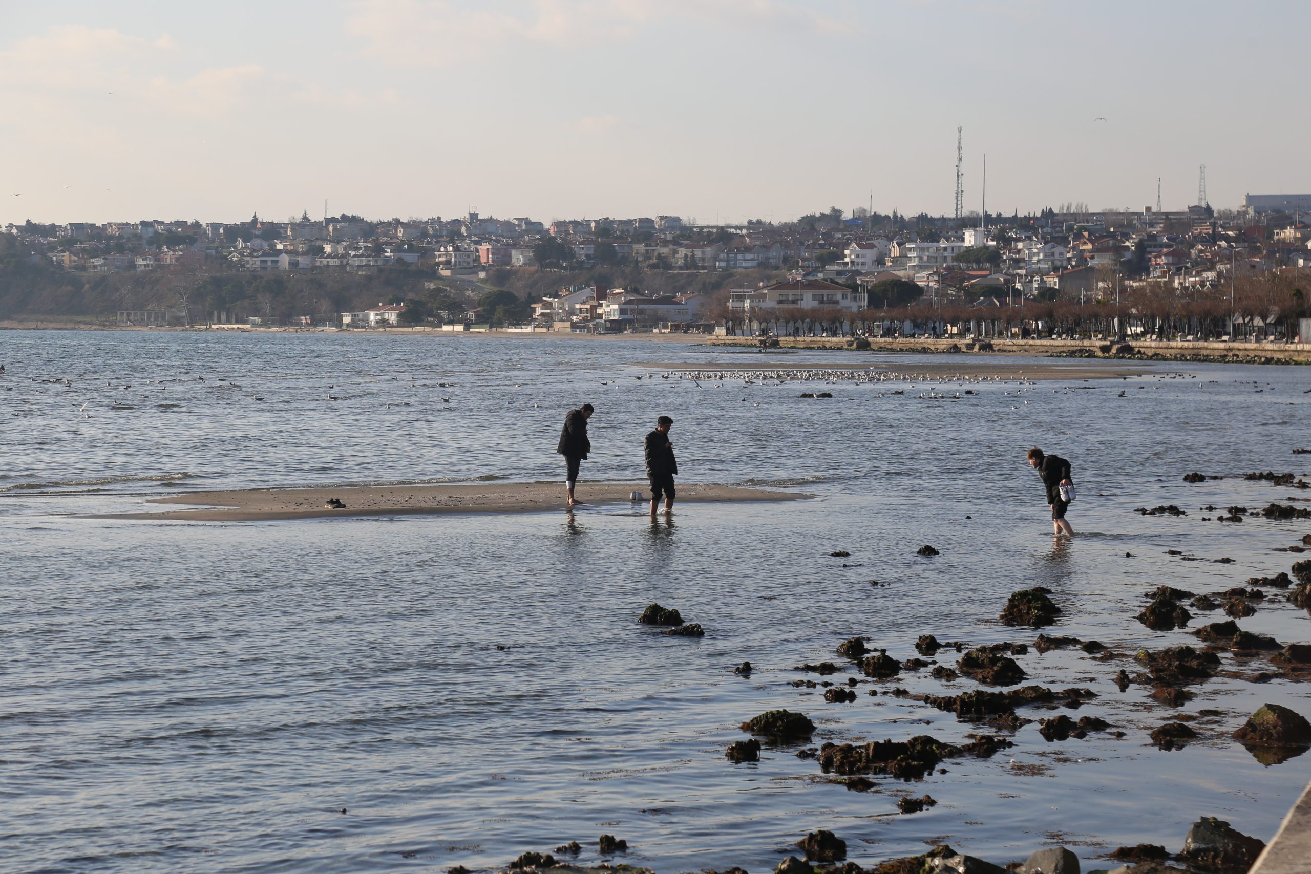 Silivri’de deniz çekildi. Vatandaşlar ortaya çıkan adacıklarda selfie çekiyor!