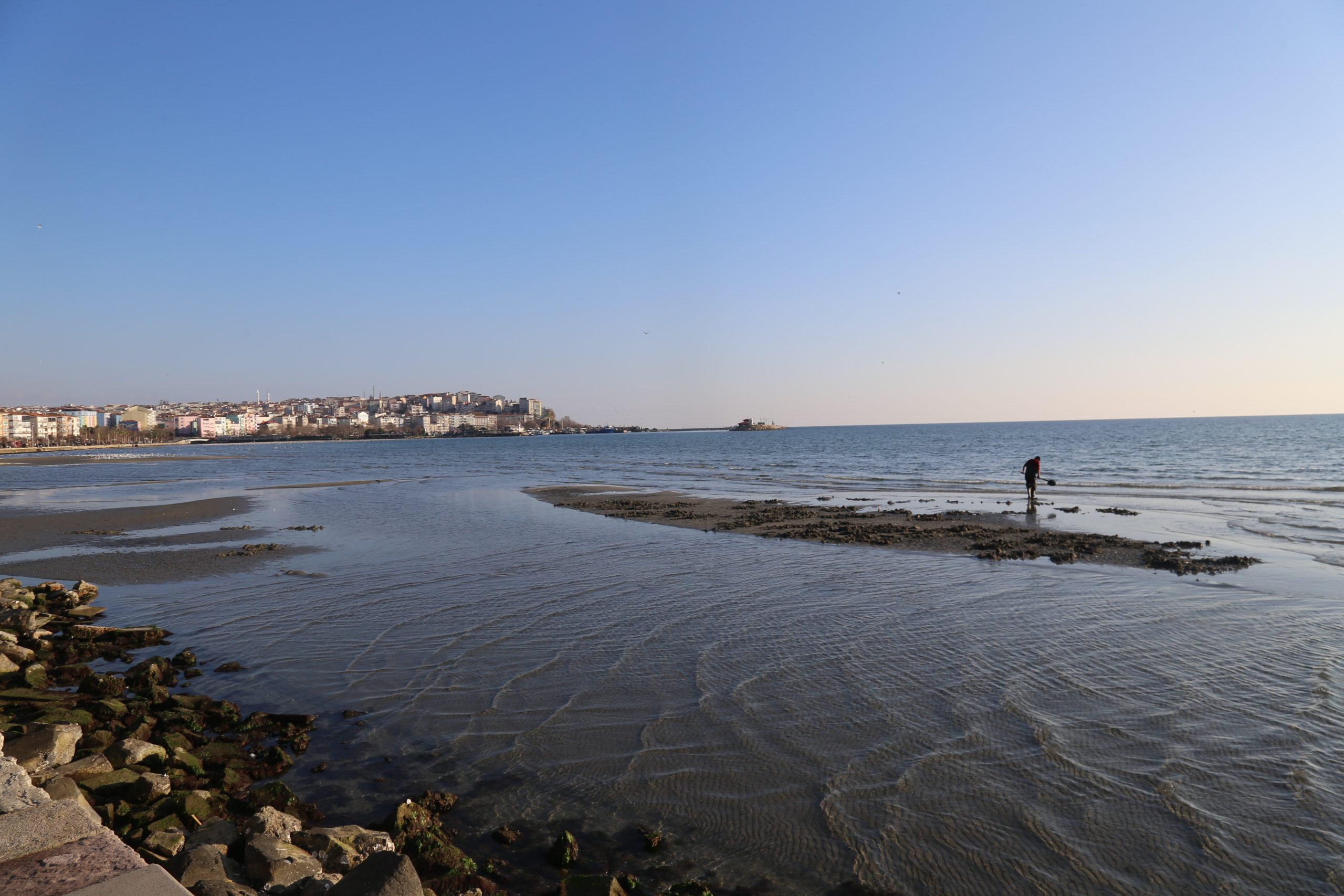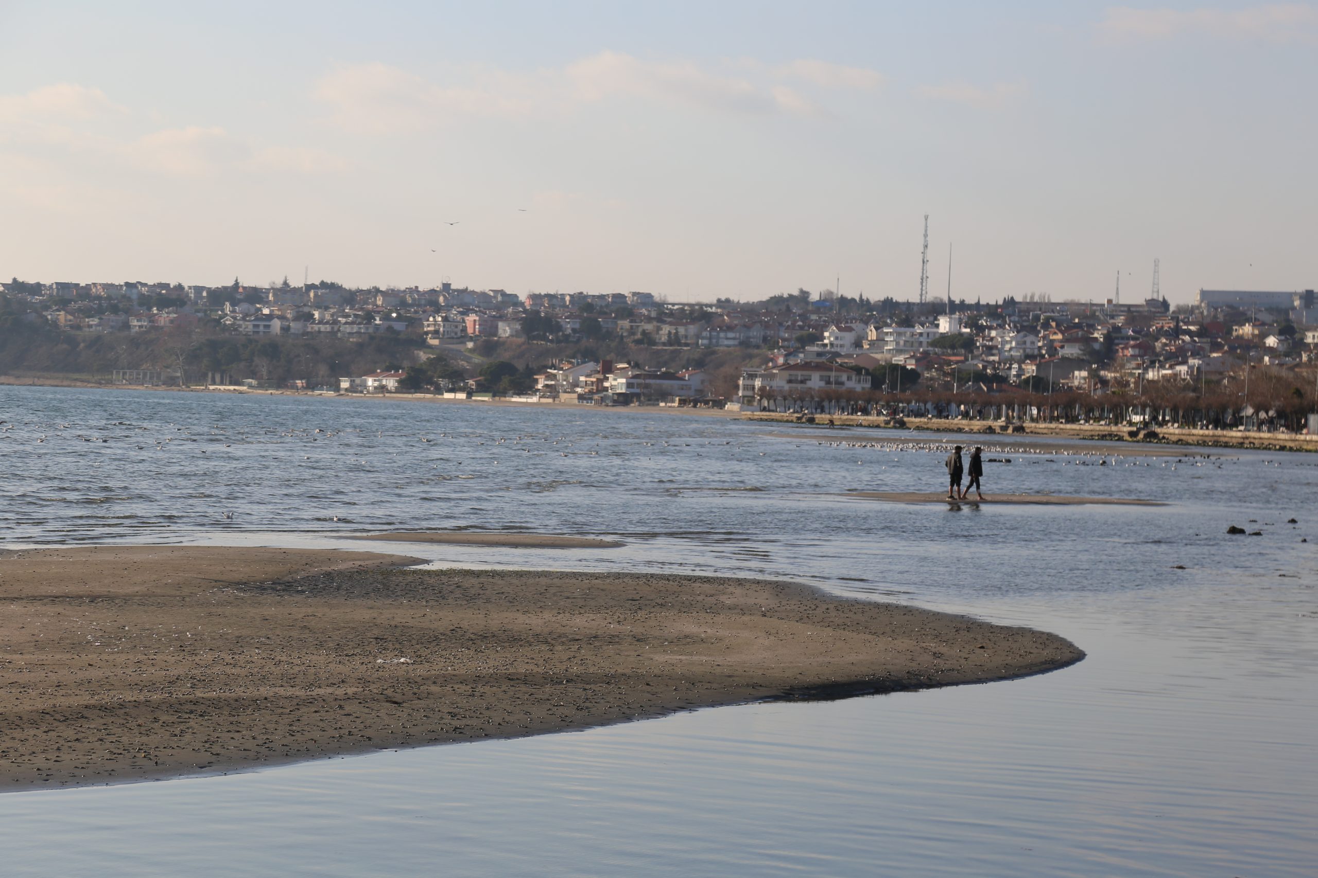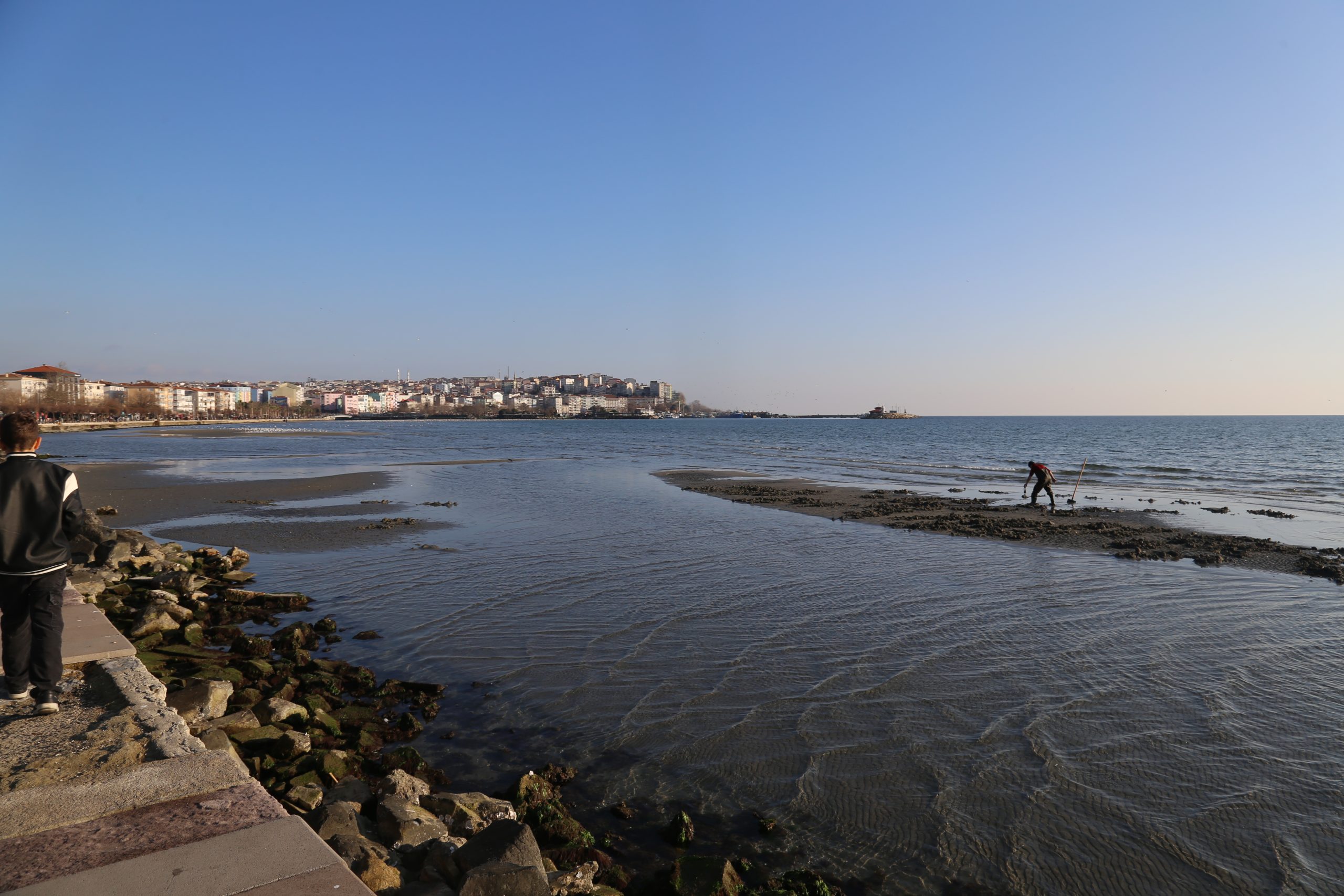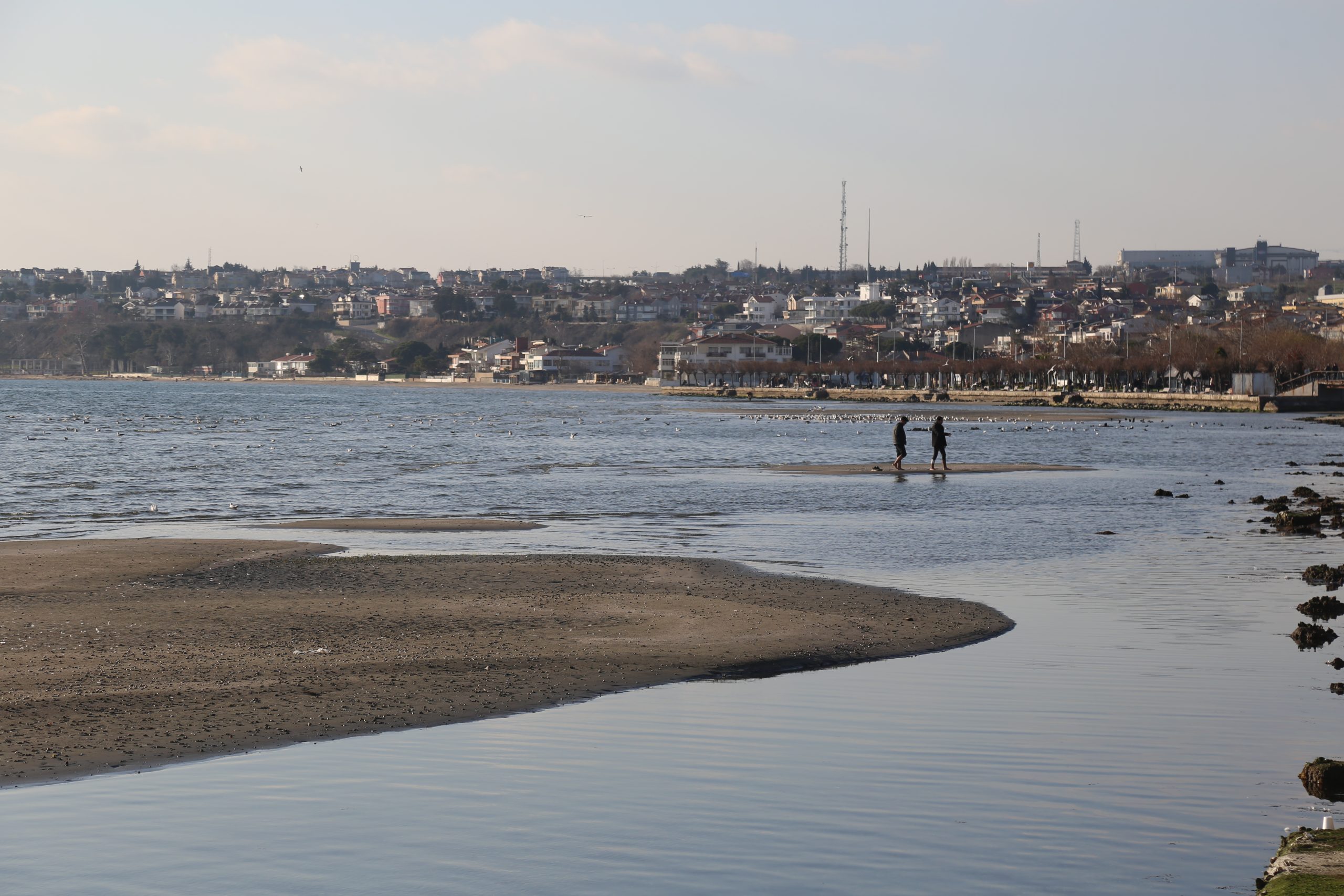 Silivri’de deniz çekildi. Vatandaşlar ortaya çıkan adacıklarda selfie çekiyor!